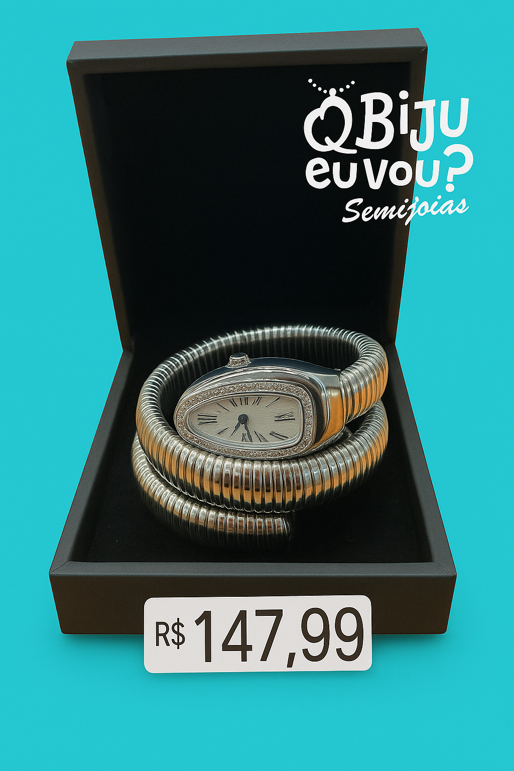 O relógio possui design moderno e sofisticado, com pulseira metálica prateada em estilo espiral que se ajusta ao pulso de forma envolvente. O mostrador tem formato oval alongado, com contorno cravejado de pequenas pedras brilhantes, e números romanos em tom prateado sobre fundo claro. O ponteiro dos segundos é azul, acrescentando um toque refinado ao visual.